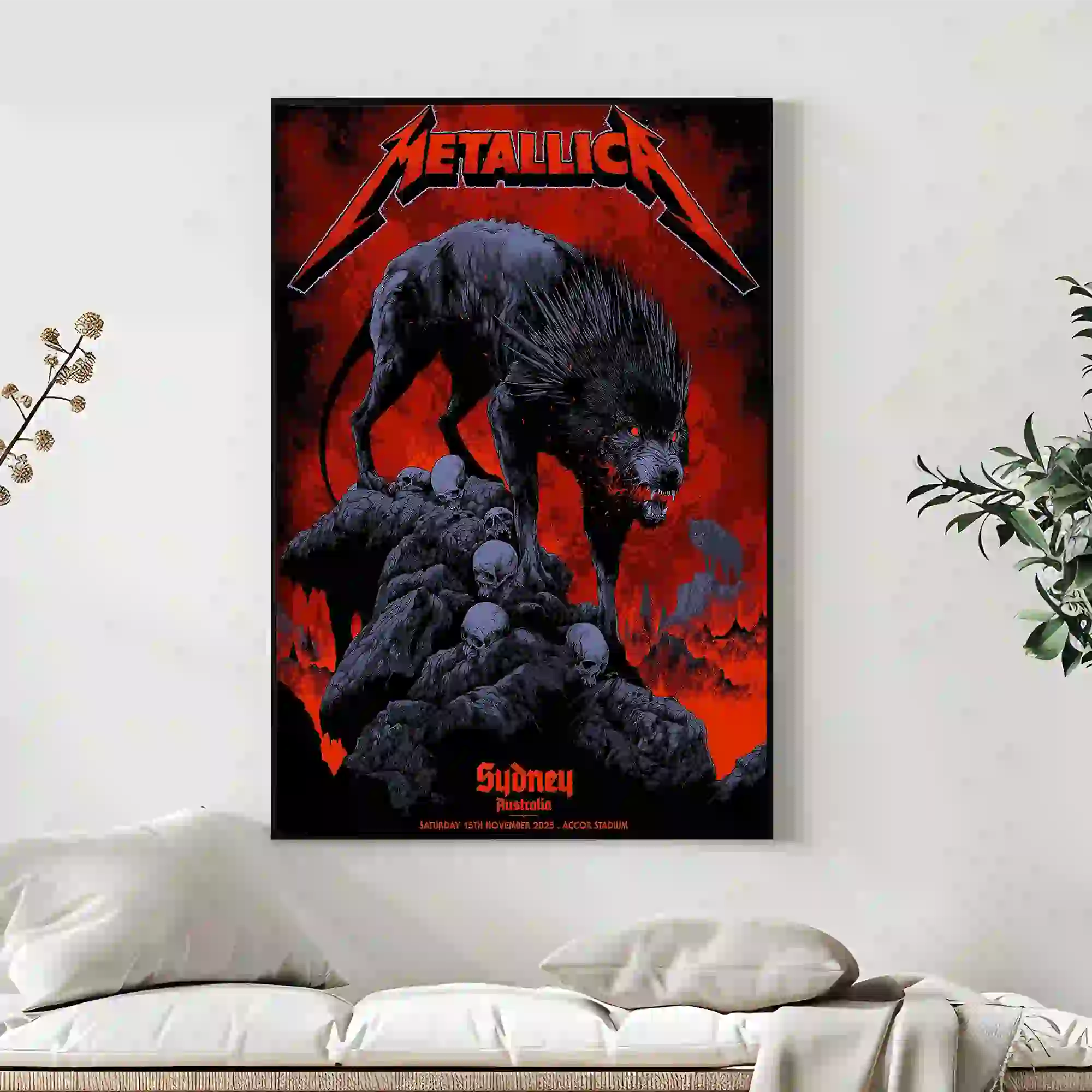 Experience the electrifying essence of Metallica with this exclusive concert poster, commemorating their highly anticipated performance in Sydney on November 15, 2025, at Accor Stadium. This visually striking artwork, featuring a fierce creature set against a backdrop of glowing red and ominous skulls, embodies the band’s iconic style and energy.