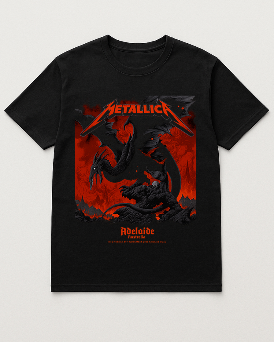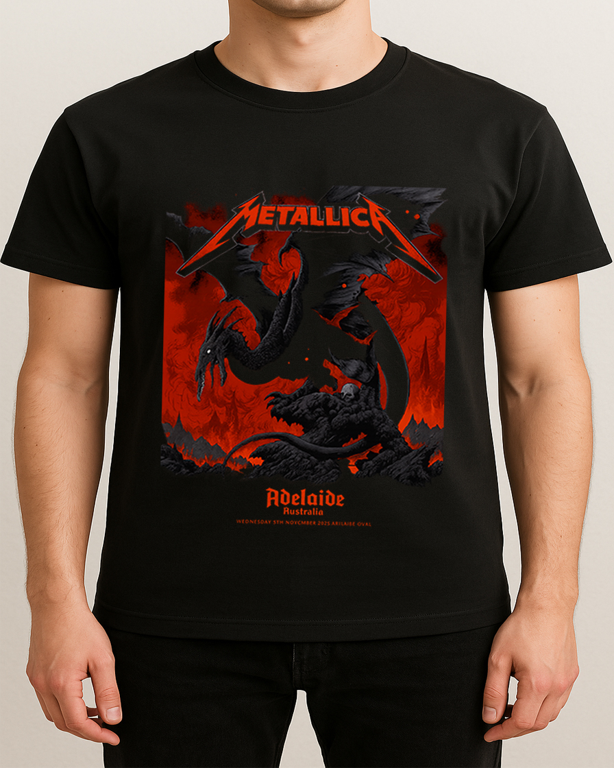 Elevate your wardrobe with the Metallica Adelaide Tour T-Shirt, a must-have for any dedicated fan. Crafted from high-quality cotton, this black tee offers superior comfort and durability, ensuring it will become a staple in your collection.